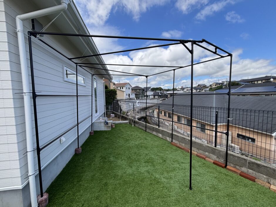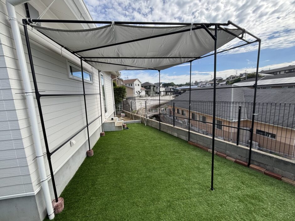 高さも広さも諦めることなく、自分の家の庭にピッタリのタープテントが完成。