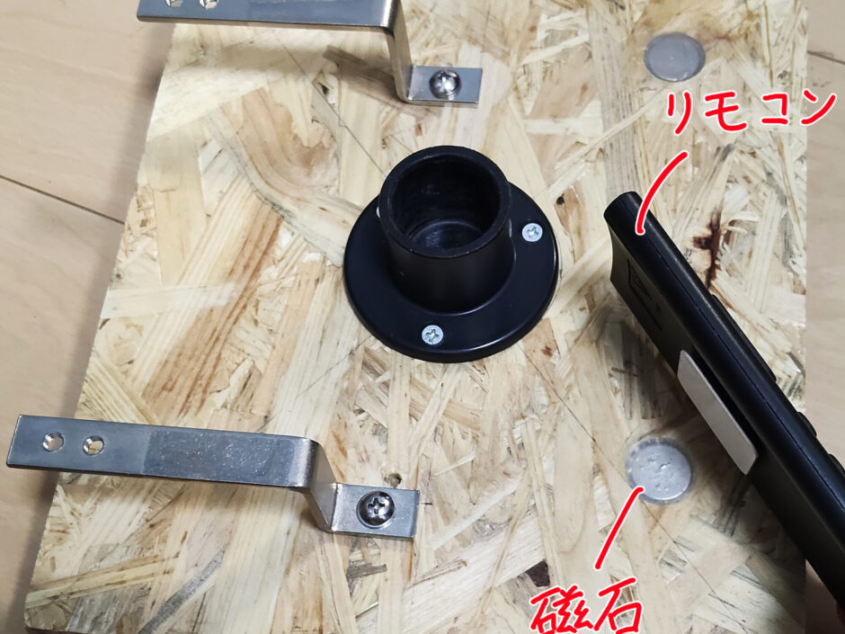 裏面に薄い穴を開けてネオジウム磁石を埋めてグルーで閉じて固めます。リモコン側には100均のスチール板をつけます。