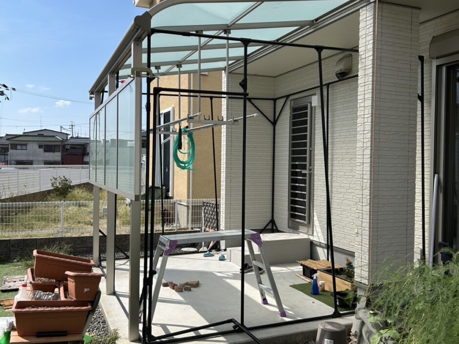 間口約330cm、奥行約280cm、高さ約250cmとなかなかの広さなので、風に吹き飛ばされないようにしっかりと既存の壁と柱の間にハマるように作りました。