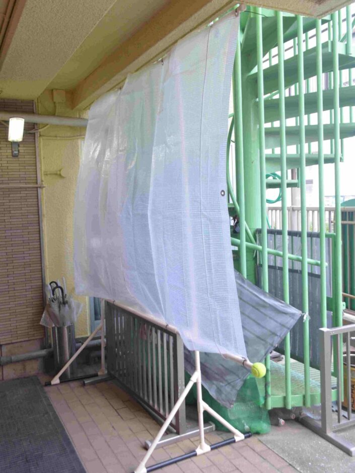 強風でも転倒しないよう本体上部は建物壁面と非常階段間とのスペースに納めており、下部は念のため衝立フェンスに結束バンドで固定しています。