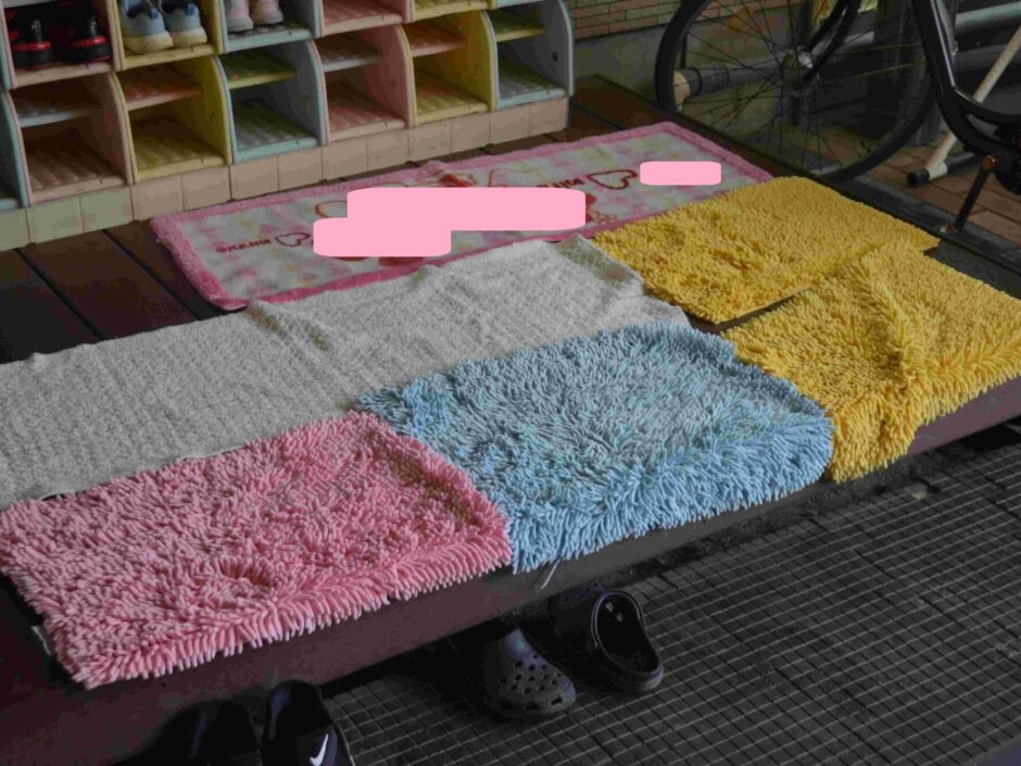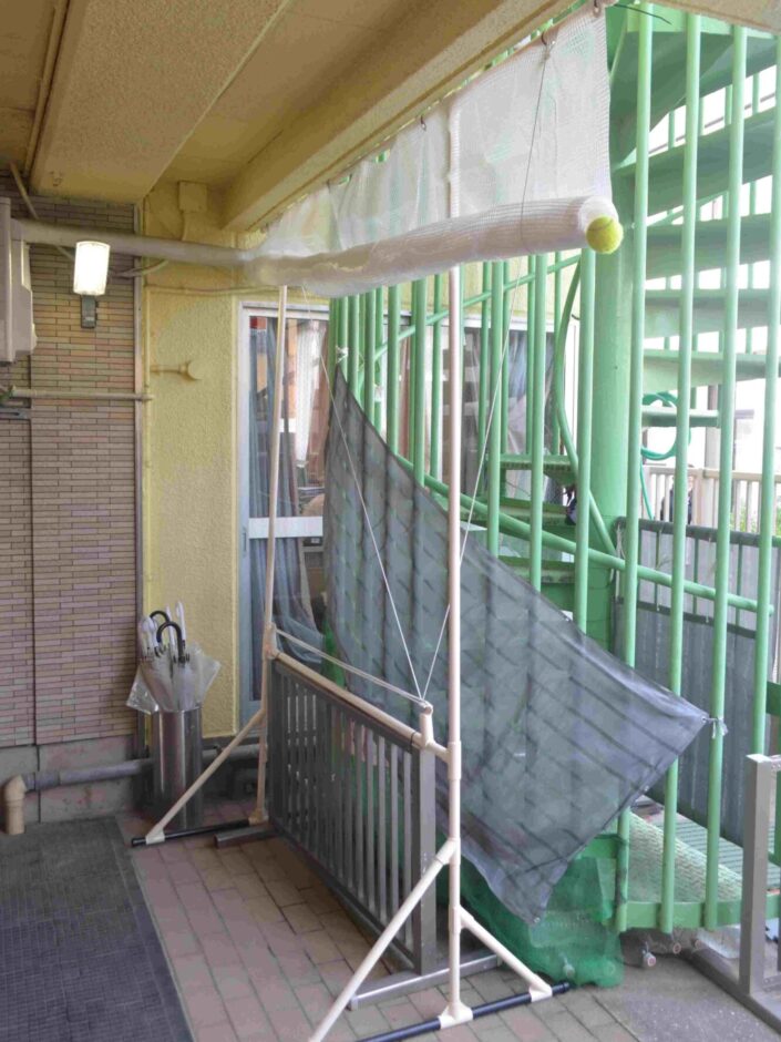 横棒パイプ端には子どもが接触した際の怪我防止のために硬式テニスボールを嵌めてクッションガードとしています。