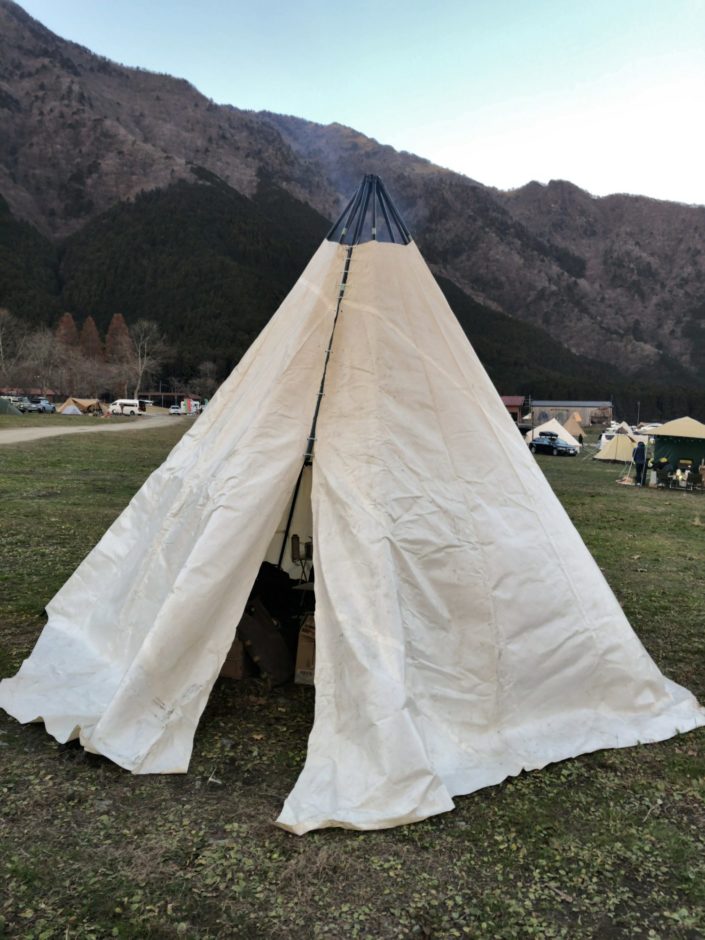 冬のキャンプで寒さを和らげるために何かできないかと思ってた時にホームセンターでイレクターを見つけ、ティピーを制作しました。本来のつなぎ方ではありませんが、頂点部分はメタルジョイントに鎖を通して作っています。もう10年近く使ってますが問題ありません。