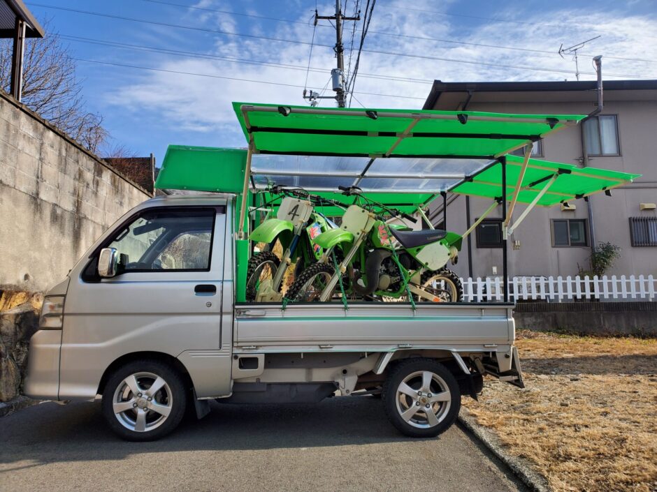 イレクターで骨組み、屋根は明り取りの透明、壁は三方開き、固定せずアオリで挟んでいるので、工具を使わず降ろせます。