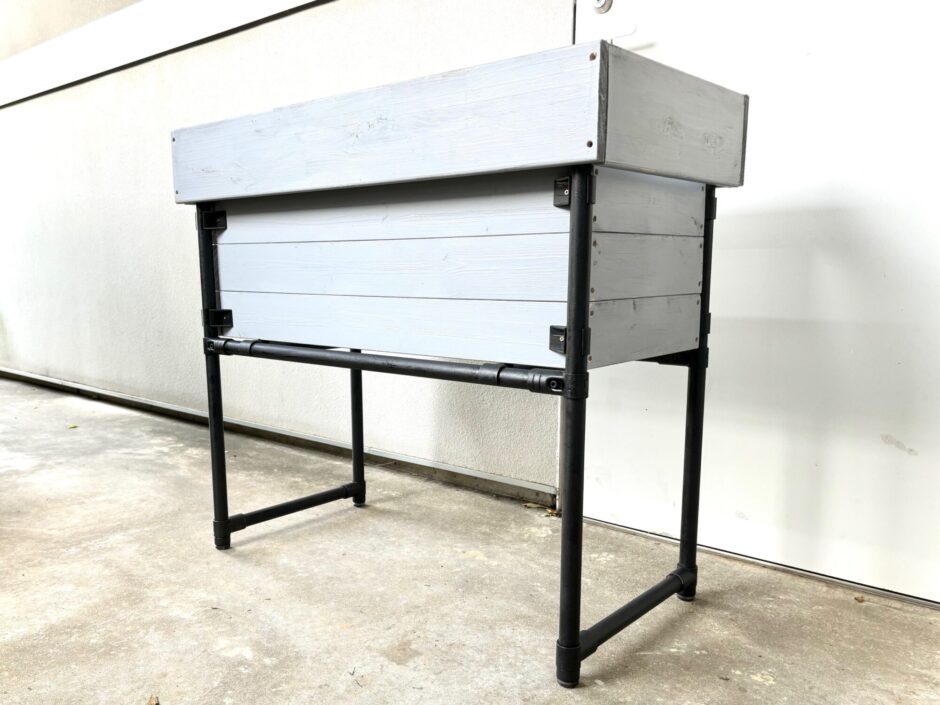 荷台部分も跳ね上げ式で荷物の積み下ろしにとても便利です。写真は制作途中だったために手で支えていますが、後にストラップで吊れるように工夫しました。