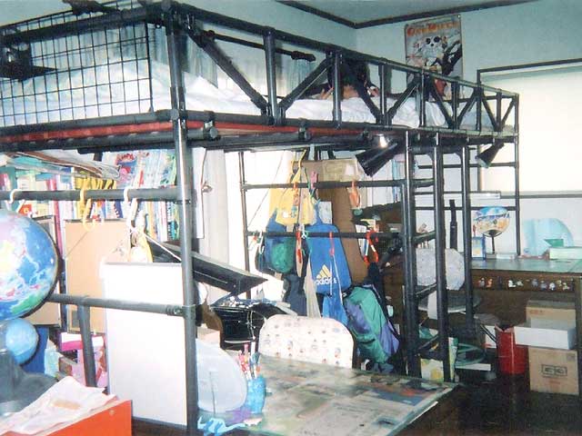 ビッグサイズのロフト型ベッド、そして下は置く・吊るす・掛ける・収納も兼ねる多目的(勉強)