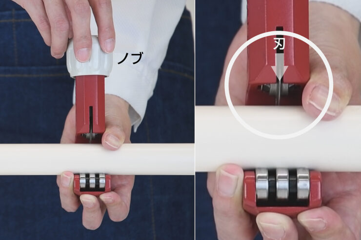 ノブを右に回転させると、刃がパイプに食い込んでいく構造になっています。